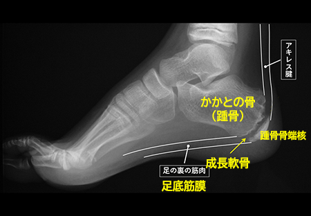 骨端線は物理的に弱く、かかと部分の骨(踵骨)には、アキレス腱と足の裏の筋肉がついているため、運動で繰り返し骨端線の周囲にひっぱる力が加わることで、炎症を起こしたり、骨に細かい傷がついたりすることが痛みの原因と言われています。
